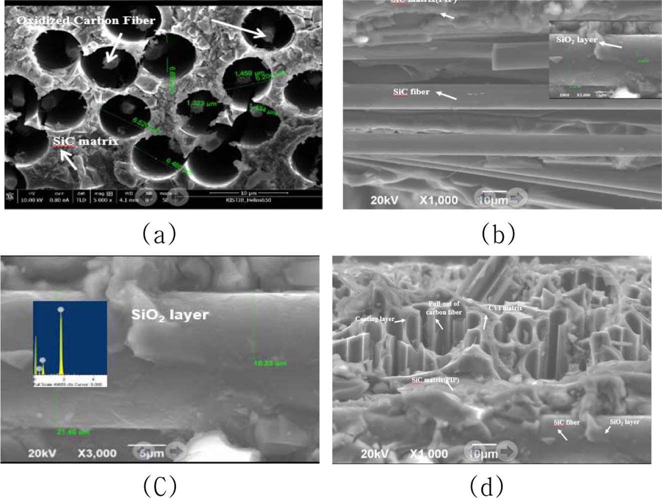 H형 시편(d)에서는 SiC 섬유가 앞에서와 같이 SiO2 필름으로 덮여 있음을 볼 수 있으며, 탄소섬유는 직경이 약 5 μm로 감소하였고, 일부는 파단 시에 pull-out된 것으로 보인다. SiC매트릭스 층도 뚜렷하게 볼 수 있다. SiC 섬유 표면 위에는 PIP 공정에 의한 SiC매트릭스층과 탄소섬유 자리 주위에는 CVI에 의한 코팅층과 SiC매트릭스 층을 관찰할 수 있다.