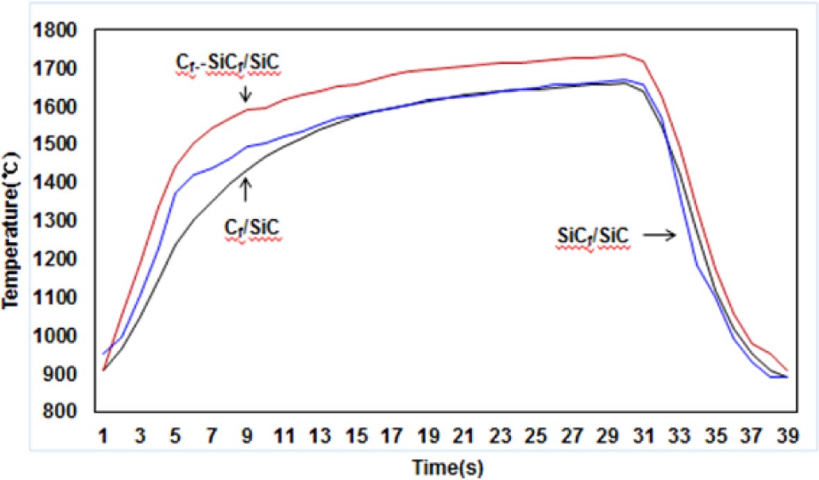 Fig. 12 Surface temperature recording for 30 s ablation test of 3 kind of CMC specimens |