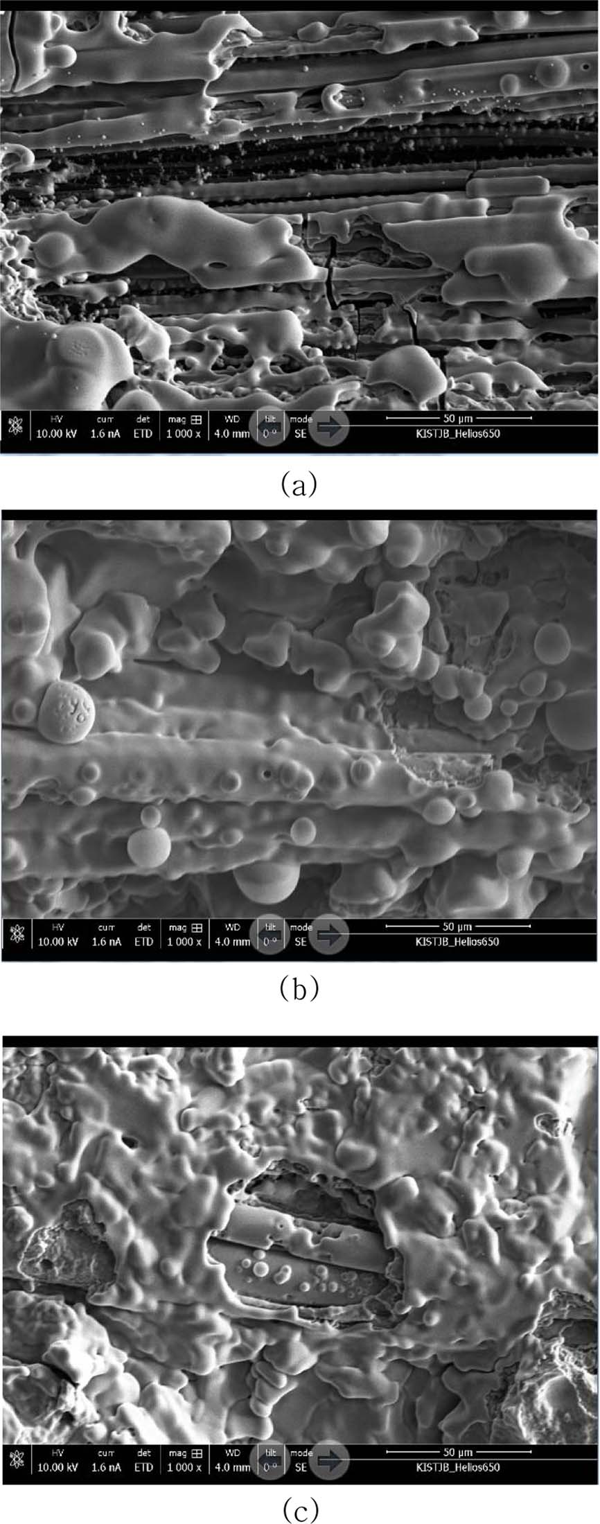 Fig. 10 SEM images of 3 type of CMC specimens after thermal shock cycle test at 950℃ |