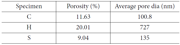 3종류의 시편에 대한 기공율을 측정하였다. Table 1에서 보듯이 C형과 S형 시편은 약 10 wt%의 기공율을 나타내었으나, H형은 2배 많은 기공율을 갖고있다. 이는 앞서 언급한 바와 같이 사용한 2종류 섬유의 필라멘트 수의 차이로 인하여 형성된 큰 공간에 매트릭스가 완전하게 채워지지 않았기 때문이다. 평균 기공 크기에 있어서도 기공율과 같은 원인으로 인하여 H형 시편은 700 nm로 C형과 S형에 비하여 6배나 큰 기공을 나타내었다.