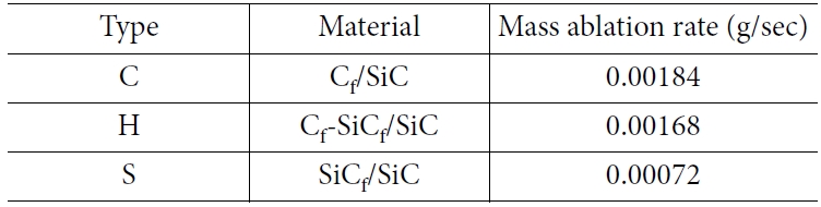 토취 시험에서 삭마량은 무게의 변화로 비교하였다(Table 5). 탄소섬유를 사용한 시편 C는 가장 많은 삭마량을 나타내었으며, SiC 섬유를 혼합하여 사용한 시편 H형은 시편 C에 비하여 약 8.6% 낮은 삭마량을 보여주었다. SiC 섬유로 구성된 S형 시편은 C형 시편에 비하여 약 67% 적은 삭마량을 나타내어 내삭마성이 가장 우수한 것으로 나타났다. 이 같은 경향은 TGA 실험 결과와 일치한다. 그러나 정량적 측면에서는 H 형과 C 형은 중량 감소의 큰 차이로 H형의 우수한 산화저항성을 보여 주었으나, 토취 시험에서는 큰 차이를 나타내지 않고 있다. 이는 앞서 언급한 바와 같이 H형 시편의 기공율이 20%에 달하여, 토취 시험 시에 가스의 고속 및 압력에 의하여 특히 기공 부분을 공격하여 매트릭스의 기계적 삭마를 일으키고 섬유-매트릭스 계면을 분리하고, 노출된 탄소섬유나 코팅층을 기계적 혹은 화학적으로 삭마를 일으킴이 주요 원인으로 본다.