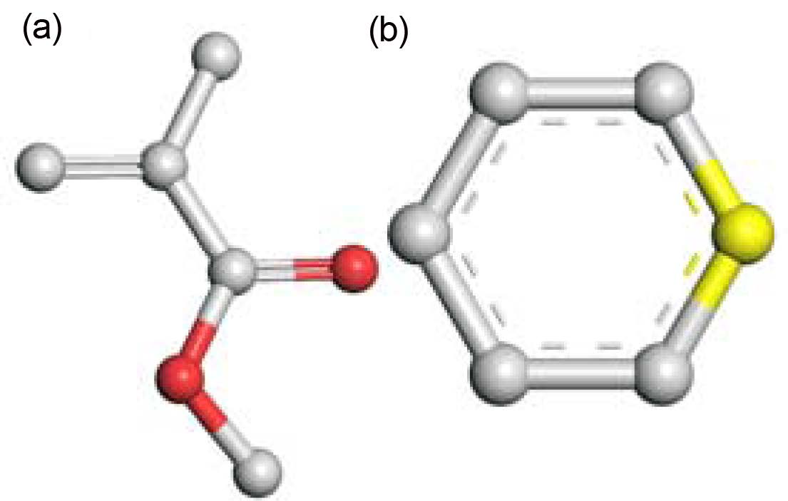 본 연구에서는 각 원자간의 포텐셜을 계산하기 위해 조합된 PCFF-TraPPE(UA) 포텐셜 함수를 도입하였다[17]. 계산에 소모되는 시간을 절감하기 위해 탄소 원자와 그 주변에 결합된 수소 원자를 한 개의 입자로 계산하는 united atom level의 coarse-grained 모델이 적용되었다. PCFF-TraPPE(UA) 포텐셜은 PCFF 포텐셜의 결합 항과 TraPPE(UA) 포텐셜의 비결합 항을 조합함으로써 구성되었다. 연구에 사용한 MMA단량체와 개시제의 모델과 포텐셜은 Fig. 1에 표시되어 있다.