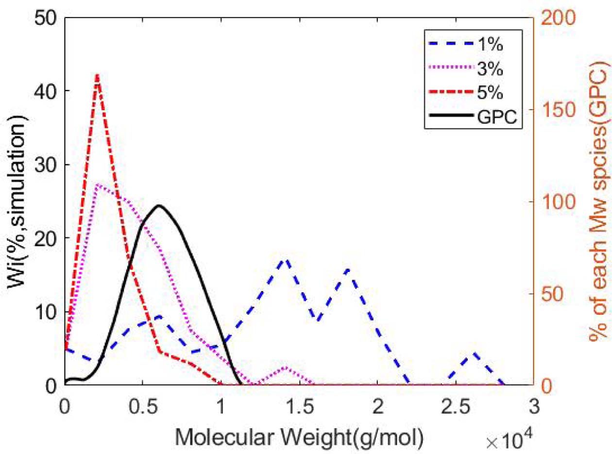 Fig. 2 Molecular weight distribution of the PMMA model of 1%, 3%, 5% initiator ratio plotted with typical experimental distribution of PMMA [21]. The molecular weight distribution diagram from the experimental result was rescaled to visually compare to simulation results |