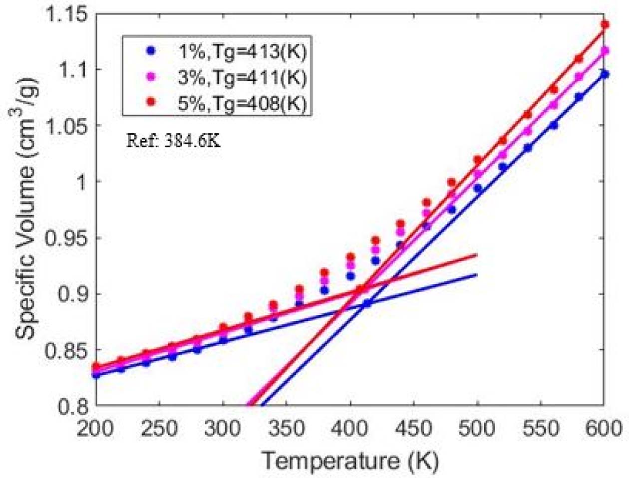 자유 라디칼 중합 알고리즘을 통해 생성된 고분자 구조에 대해 large-scale atomic/molecular massively parallel simulator(LAMMPS)[20] 시뮬레이터를 이용하여 유리전이온도와 기계적 물성을 계산하였다. 유리전이온도는 실험과 동등한 방법인 cooling down 시뮬레이션을 통해 구하였다. 고분자 구조를 cooling down하는 과정에서 온도에 따른 부피 변화의 기울기가 변하는 지점을 고분자의 상변화가 일어나는 온도로 가정하였다. Cooling down 시뮬레이션은 고온의 600 K에서 저온의 200 K까지 1 × 1011 K/s의 cooling rate로 수행되었다.