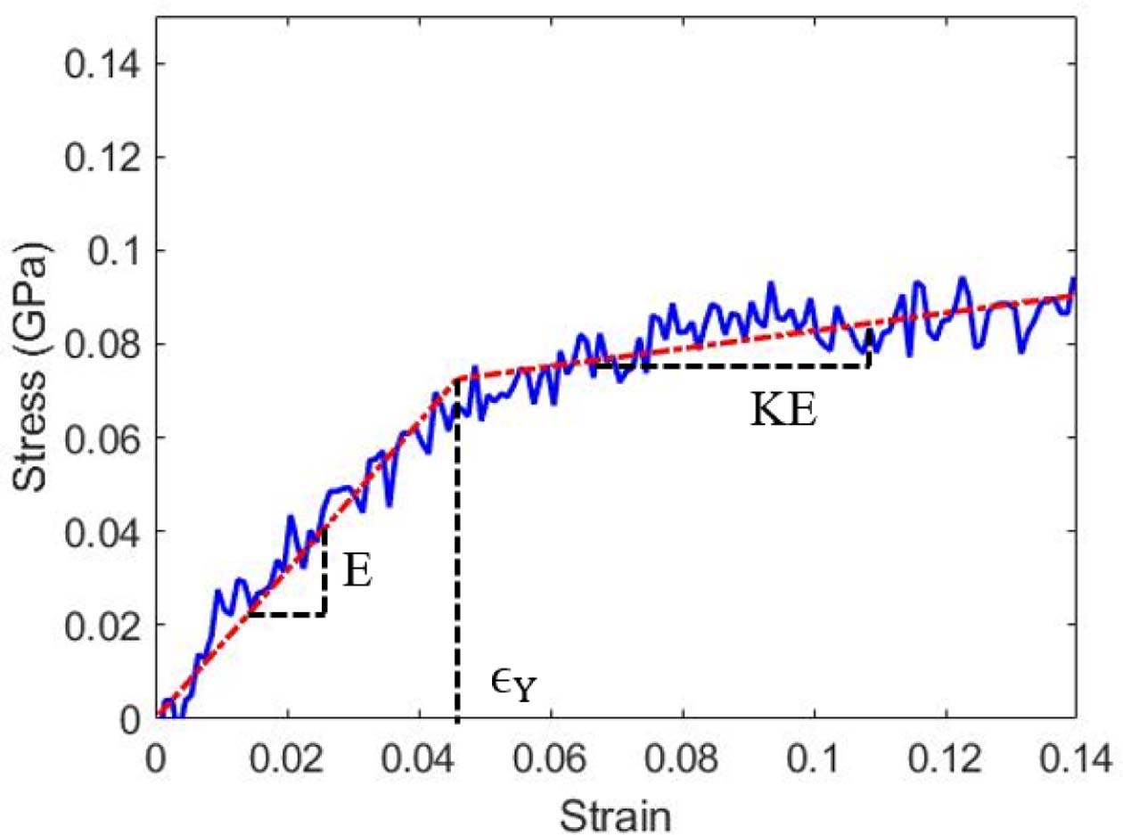 고분자의 단축 인장 시뮬레이션과 전단 시뮬레이션을 통해 얻어진 응력-변형률 곡선의 선형구간에서의 기계적 강성과 재료의 거동이 소성 영역에 도달하는 항복 응력을 도출하였다. 각 모델에 대해 인장 및 전단 시뮬레이션은 3회씩 수행하였으며, 응력-변형률 곡선은 bilinear elasto-plastic model을 이용하여 피팅하였고[25], 그 수식은 다음 식 (3)과 Fig. 4와 같이 표현된다.