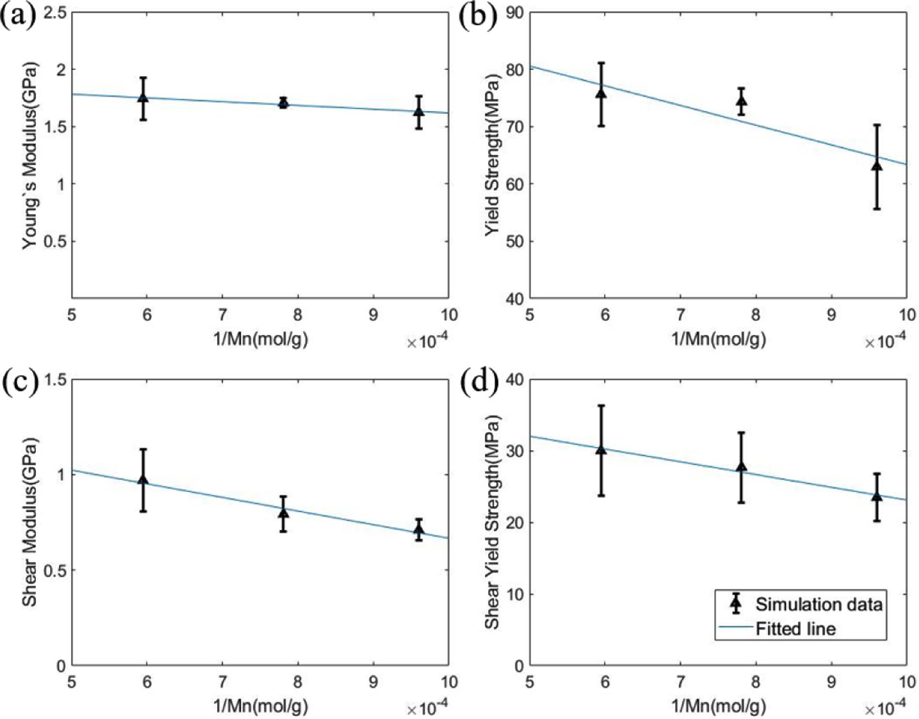 Fig. 5 (a) Young’s modulus, (b) tensile yield strength, (c) shear modulus, (d) shear yield strength plotted by the reciprocal number of molecular weights |