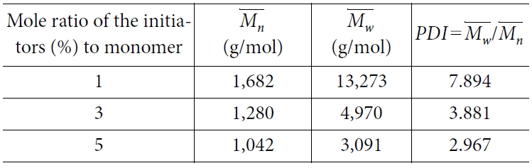 각 개시제의 비율에 따라 분자량 분포와 평균 분자량을 조사한 결과 낮은 개시제의 비율이 포함되었을 때 평균 분자량이 높은 것으로 나타났다. 이는 초기 모델에 포함된 단량체 분자의 개수와 변환률이 같아 중합 반응에 참여하는 단량체 분자의 개수가 같기 때문이다. 각 사슬은 개시제로부터 성장을 시작하기 때문에 사슬의 개수는 개시제의 수와 같고, 따라서 개시제가 적을수록 각 사슬에 결합된 단량체의 개수가 평균적으로 많아지는 것으로 해석된다. 또한 낮은 개시제 비율의 모델에서 다분산지수가 높아지는 현상을 확인했는데, 이러한 현상은 분자량이 작은 단량체들이 분자량 계산에 포함되어있기 때문으로, 평균 분자량과 단량체의 분자량 차이가 더 크기 때문에 분산이 높게 나타난 것으로 해석된다.