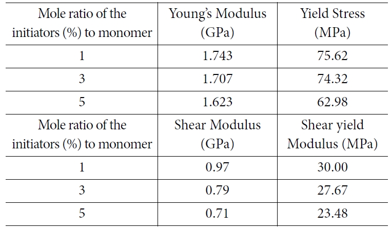 식 (3)에 표현된 bilinear model은 항복 스트레인 이전의 탄성구간과 항복 스트레인 이후의 소성구간을 나누어 2개의 선형 구간으로 나타난다. Bilinear 모델에서 피팅하여 결정하는 파라미터는 3개로 탄성구간에서의 기울기인 영률(E), 기울기가 바뀌는 지점인 항복 스트레인(εY)과 소성구간과 탄성구간의 기울기 비율인 hardening parameter(K)로, 시뮬레이션을 통해 얻은 응력-변형률 선도와 bilinear model간의 오차가 최소가 되도록 하는 방법을 통해 결정하였다. 위와 같은 피팅 방법을 통해 각 분자량에 따라 인장 및 전단 강성과 항복 응력을 비교하여 Fig. 5와 Table 2에 표시하였다.