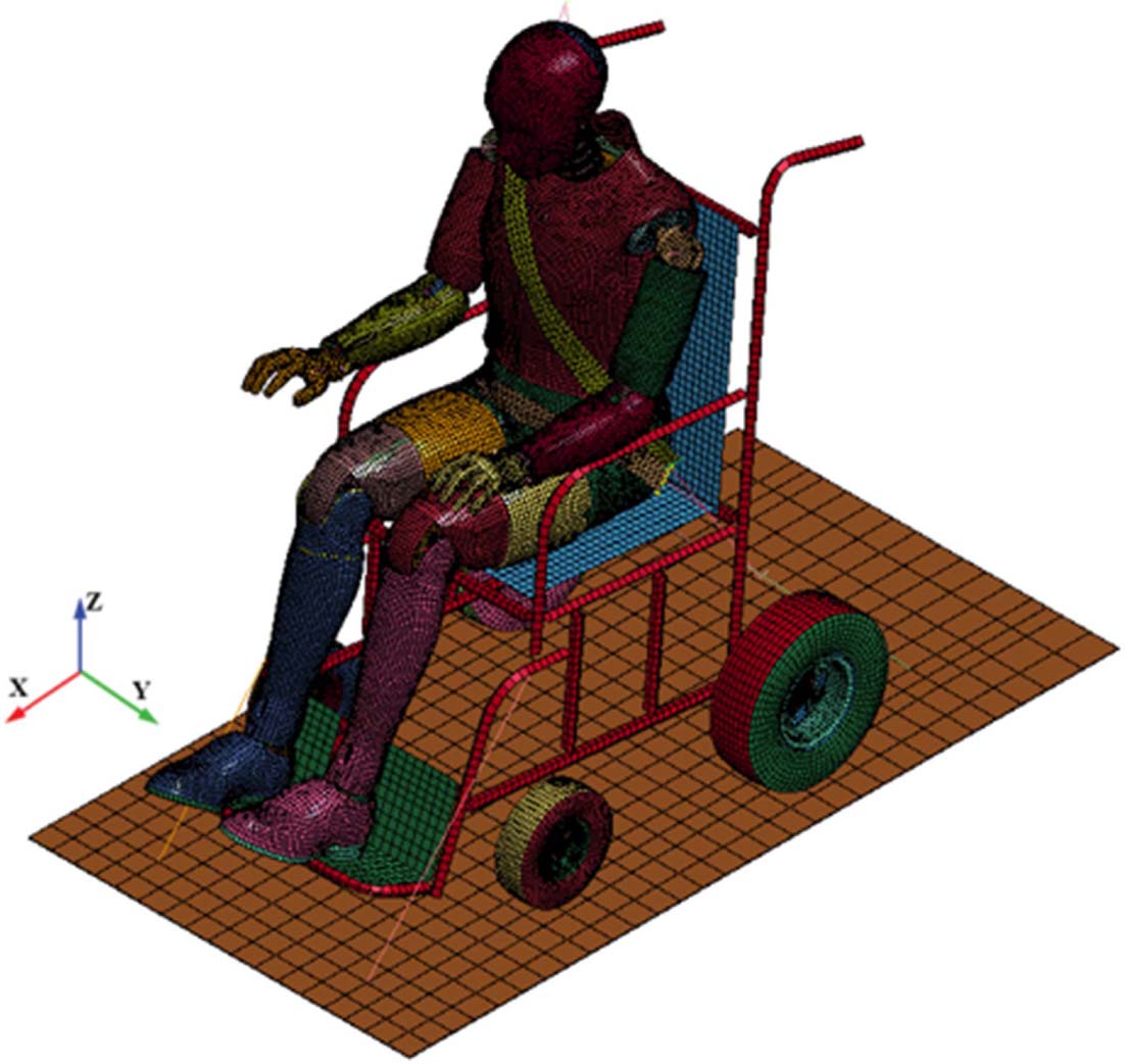 Fig. 1 FE model of dummy and wheelchair for sled test analysis |