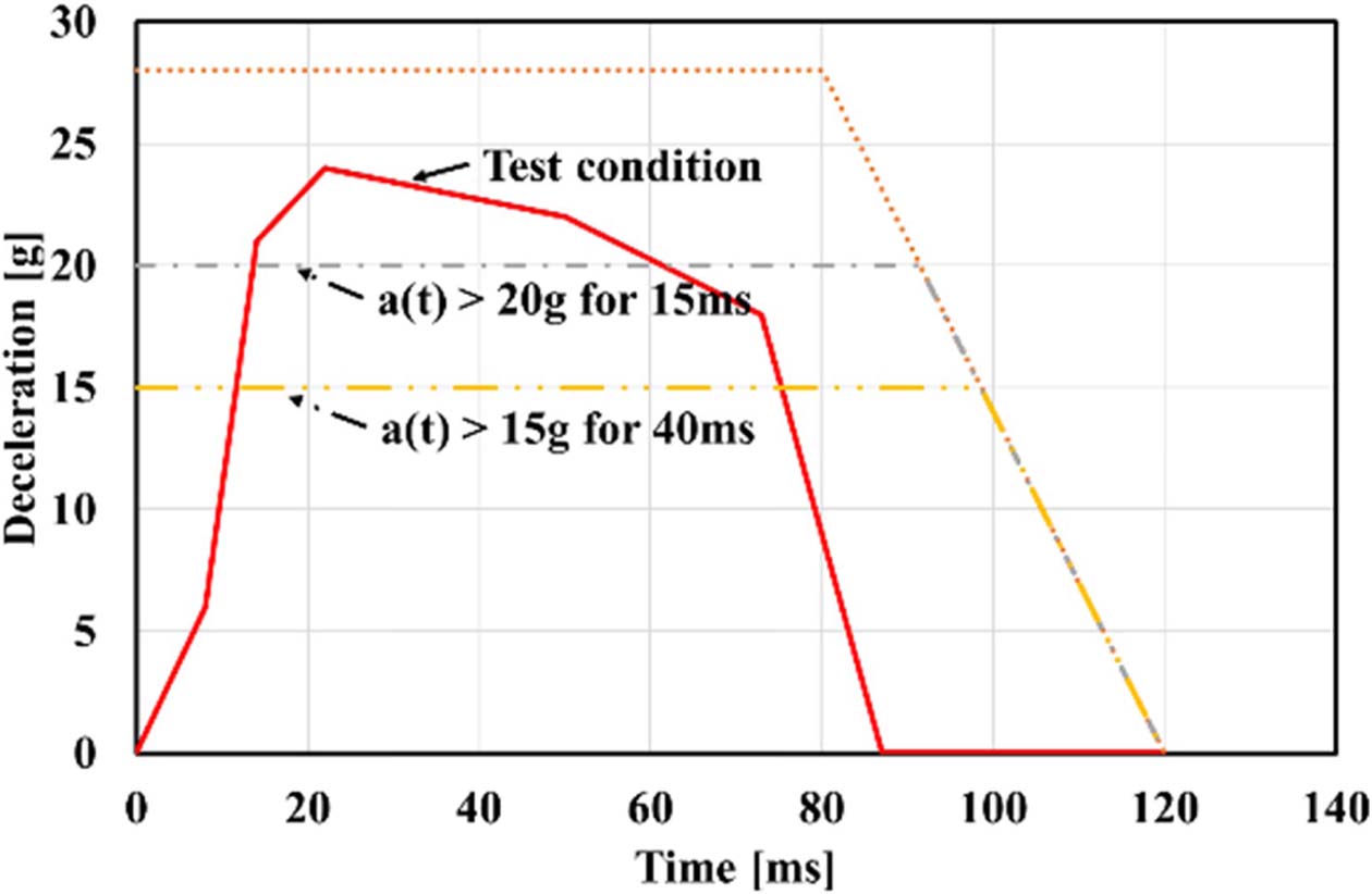 본 연구에서는 ISO 10542를 참조하여, 초기속도 48km/h에서 Fig. 2에 나타나 있는 테스트 조건(Test condition)을 사용하였다. 테스트 조건으로는 감속도가 t0에서 tf까지 적어도 75 ms의 지속시간을 가지며 최소 15 ms의 시간 동안 20 g를 초과, 최소 40 ms동안 15 g를 초과해야 한다.