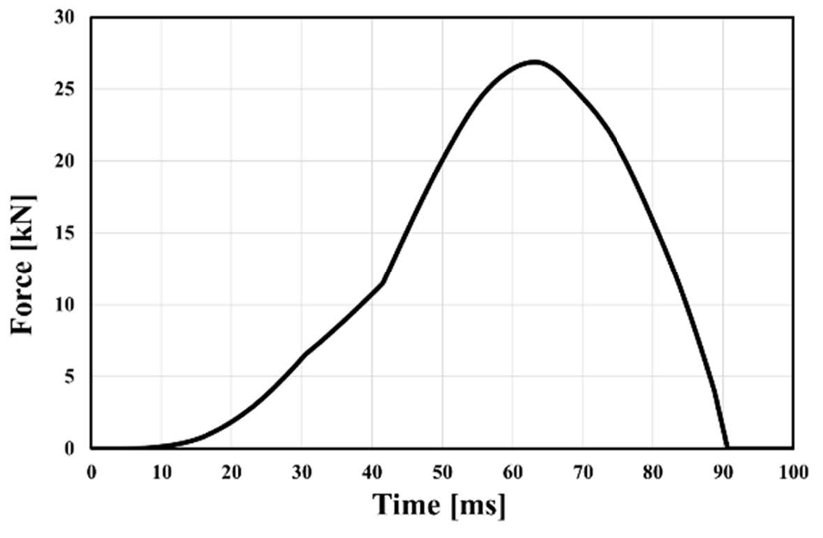 Fig. 3은 슬레드 전방 충돌 해석에서 인체 모형의 거동 및 휠체어 고정 벨트(Tie-down belt)의 상태를 나타내었다. 결과를 통해 휠체어 고정 벨트의 파손이 일어나지 않음을 확인하였다. 또한 전방 충돌 시 전방 고정 벨트보다 후방 고정 벨트에 더 많은 하중이 작용되는 것으로 나타났다. 그렇기 때문에 후방 고정 벨트에 작용하는 하중을 고정구의 유한요소해석 조건으로 사용하였다. Fig. 4에는 전방충돌시 후방 벨트에 작용하는 하중이 나타나 있다. Fig. 4에서 보이는 바와 같이 휠체어 후방 고정 벨트에 발생되는 하중은 90 ms동안 작용하였으며, 최대 하중은 26.9 kN으로 나타났다.