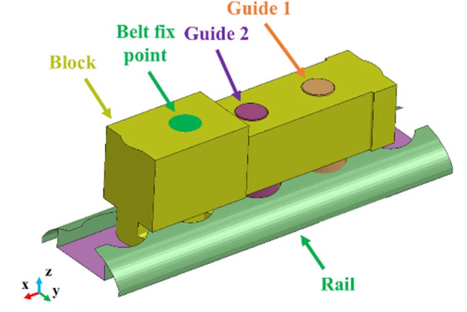 휠체어 고정구는 차량 내부에 휠체어를 휠체어 고정 벨트로 고정하기 위한 장치이며, 4개의 독립된 고정점에 설치된다. 고정구의 부품은 Fig. 5에서 나타난 것과 같이 블록, 가이드, 레일로 구성되어 있으며 휠체어 고정 벨트는 벨트 고정부분(Belt fix point)에 연결된다. 유한요소해석 모델은 고정구를 지지하기 위한 최소한의 레일을 모델링되었다. 본 연구에서 모델링 된 레일의 길이는 127 mm이고 통상적으로 사용되는 레일의 전체 길이는 약 1220 mm이다[11]. 레일의 두께는 4 mm이다.
