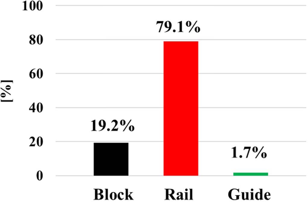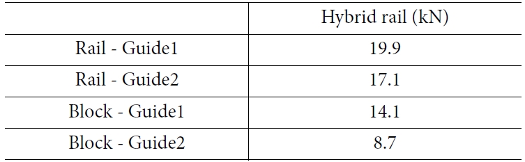 4. 각 부품 중에서 레일과 가이드 1과 2 사이의 하중은 각각 19.9 kN 및 17.1 kN으로, 블록과 가이드 사이의 하중인 14.1 kN 및 8.7 kN 보다 상대적으로 더 높게 작용한 것으로 나타났다.