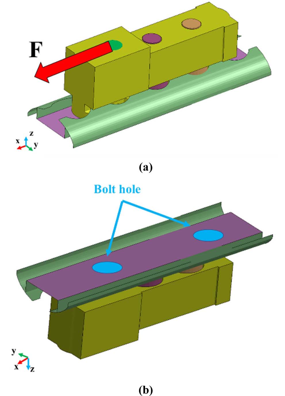 레일에 작용하는 하중을 분석하기 위하여 선행적으로 기존 고정구의 유한요소해석이 진행되었다. Fig. 7에서는 모델의 경계조건을 보여주고 있다. 벨트 고정부분에 2.2절에서 도출된 벨트에 작용하는 하중 F가 x 방향으로 부가되고, 레일 하단(Bottom) 부분에 있는 볼트 홀(bolt hole)은 고정된다.
