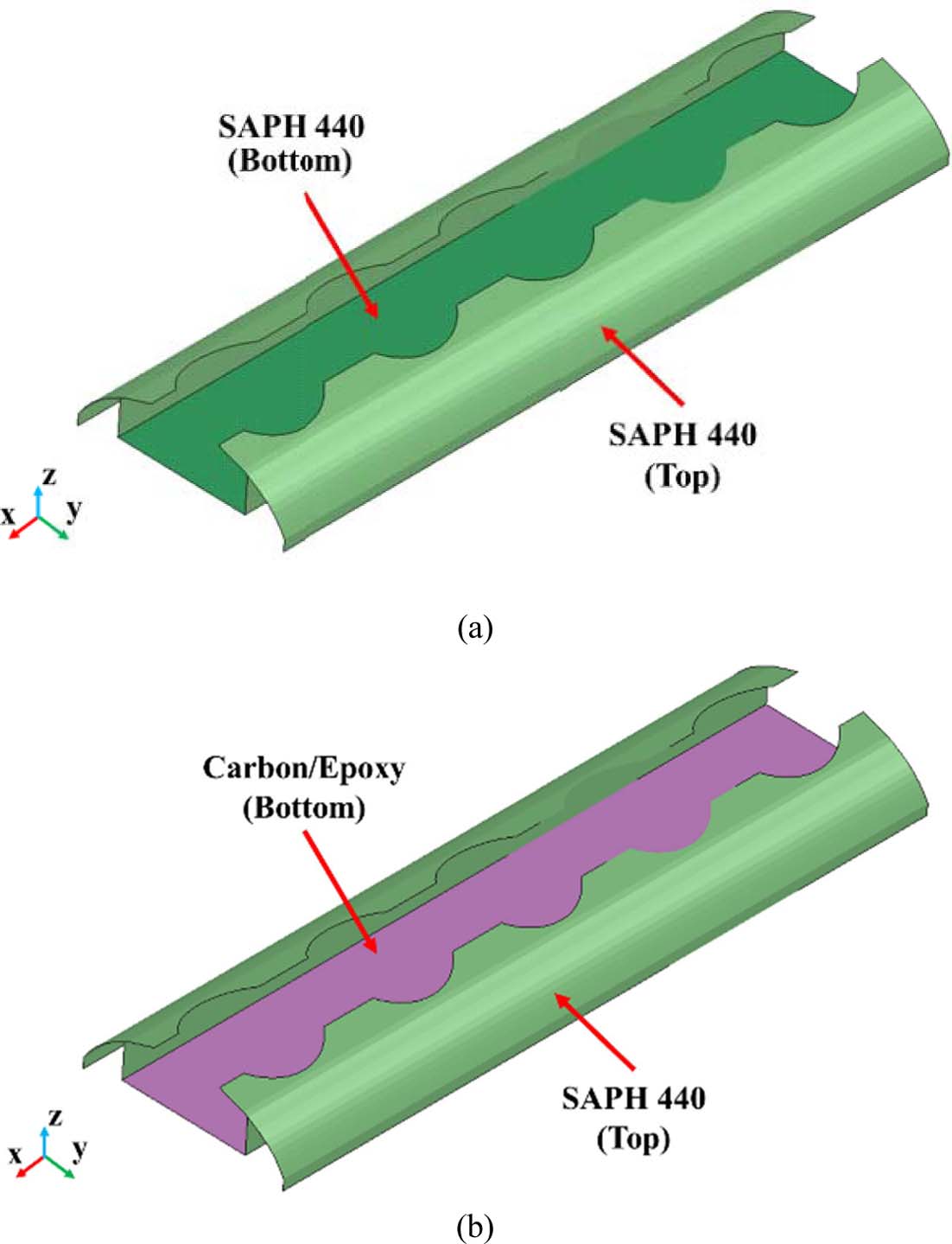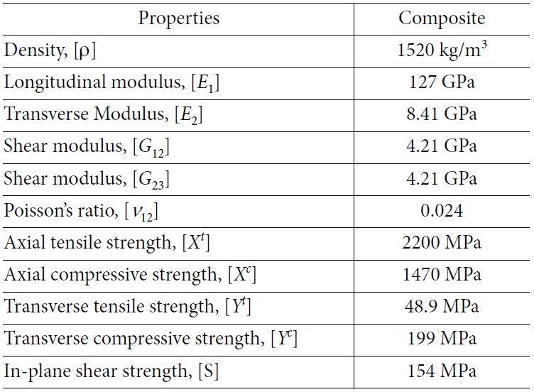하이브리드 레일의 하단 부분을 복합재 물성으로 적용하기 위하여 LS-Dyna에서 제공하는 *MAT_ENHANCED_ COMPOSITE_DAMAGE Model을 사용하였으며, Tsai-Wu 파괴 기준을 사용하였고, 공식은 식 (1)과 같다. 파괴지수가 1일 이상일 때 복합재료가 파괴된다고 알려져 있다[12].