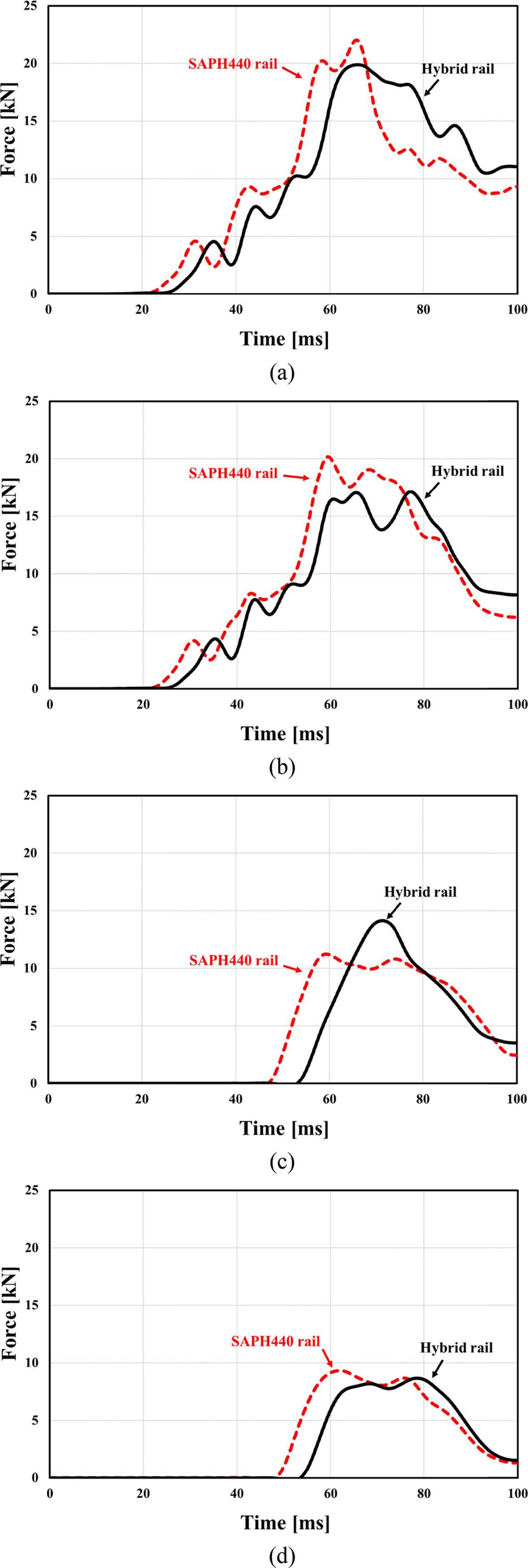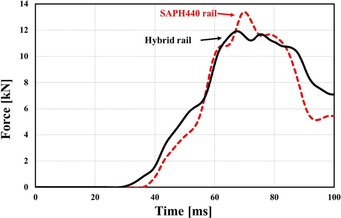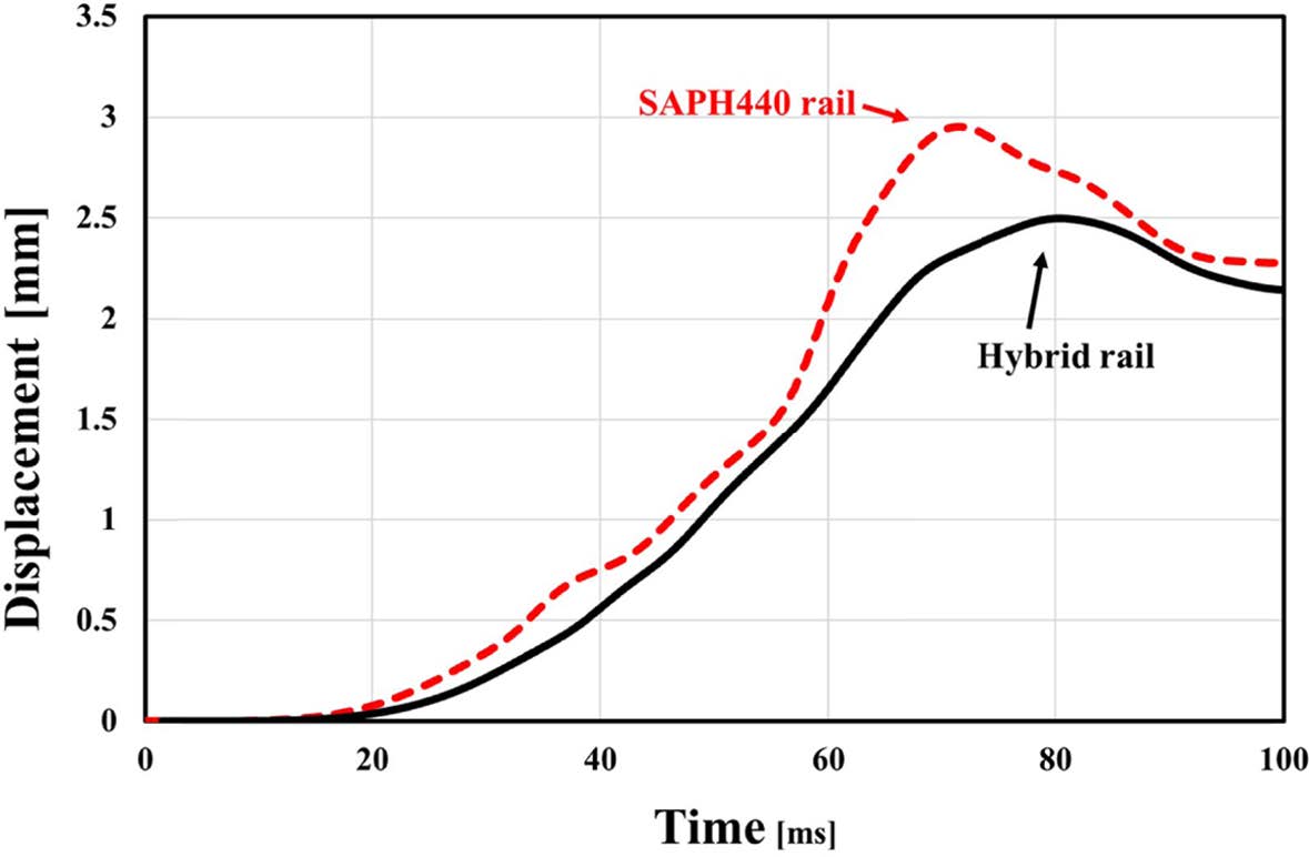 레일 부분에 작용하는 최대 하중은 Fig. 9와 같이 SAPH 440 레일은 13.4 kN, 하이브리드 레일은 11.9 kN으로 하이브리드 레일이 약 11.2% 더 낮은 것으로 나타났지만, Fig. 10과 같이 최대 변형량은 SAPH 440 레일은 3.0 mm, 하이브리드 레일은 2.5 mm로 하이브리드 레일의 변형량이 약 16.7% 더 적게 나타났다.