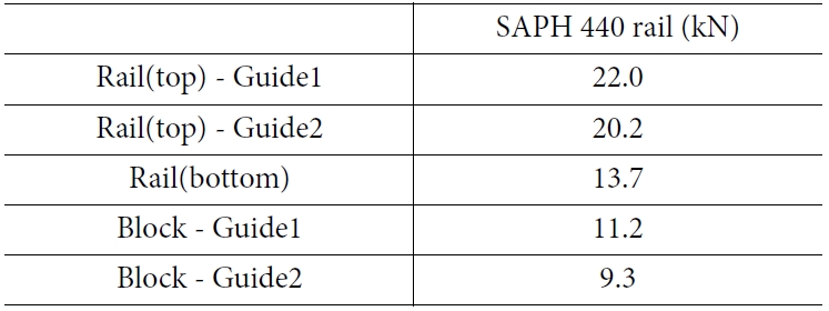각 부품 별 작용하는 하중은 Fig. 11에서 나타난 것과 같다. 각 부품 중에서 레일과 가이드 사이의 하중이 블록과 가이드 사이의 하중보다 더 높게 작용했다. Table 3은 하이브리드 레일에 각 부품들이 받는 하중을 나타낸 것이다. 하이브리드 레일과 SAPH 440 레일의 하중을 비교하였을 때, 블록과 가이드1을 제외한 나머지 부품 사이에서 작용하는 하중은 SAPH 440이 약 10.4% 더 높게 나타났다. Table 4