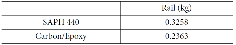 Table 1에 각 부품들이 받는 하중을 나타낸 것이다. 레일의 하단 부분은 13.7 kN의 하중을 받았다. 레일의 상단(Top) 부분은 블록과 가이드의 접촉에 의해 각각 22.0 kN, 20.2 kN의 하중을 받았고, 다른 부품들보다 높은 하중을 받는 경향을 보였다. 그렇기 때문에 Fig. 8에 나타난 것과 같이 높은 하중을 받는 레일의 상단 부분은 기존의 재료인 SAPH 440으로, 상단 부분보다 비교적 낮은 하중을 받는 레일의 하단 부분은 경량화 재료인 탄소섬유 에폭시 복합재인 하이브리드 레일을 제안하였다.