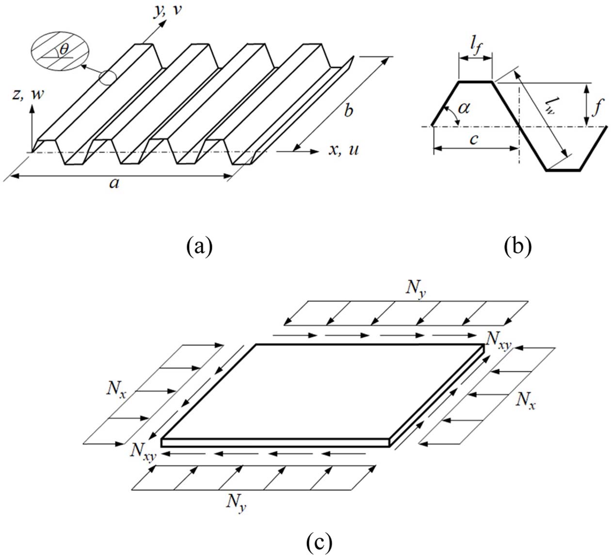 사다리꼴 주름형상을 갖는 주름판, 단위 주름형상 및 내평면 하중 조건을 Fig. 1에 나타냈다. 고려된 내평면 하중은 주름판의 중립면에 대해 x 및 y 방향 내평면 압축 하중 Nx, Ny 또는 내평면 전단하중 Nxy를 받는다. 이를 직교이방성판으로 등가시킨 모델에 표시하면 면 Fig. 1(c)와 같다. 판의 x, y 방향 길이를 a, b로, 단위 주름의 절반에 대한 축 방향 길이(주름 주기), 이에 대한 주름 길이, 주름 높이 및 주름각을 각각 c, l, f 및 α로 표현하였으며 주름판의 두께는 t이다. 적층 복합재료에서 적층각 θ는 x축에 대한 각으로 나타냈다.