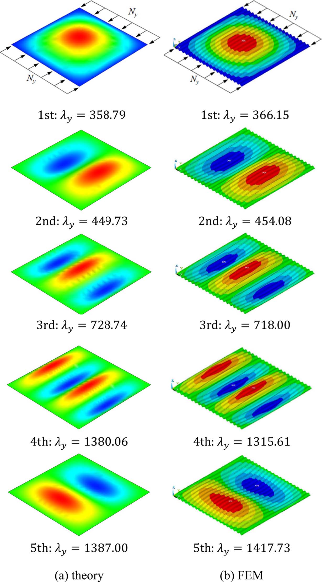 Fig. 2 Comparison of buckling loads and mode shapes of corrugated plate subjected to lateral load, Ny |
