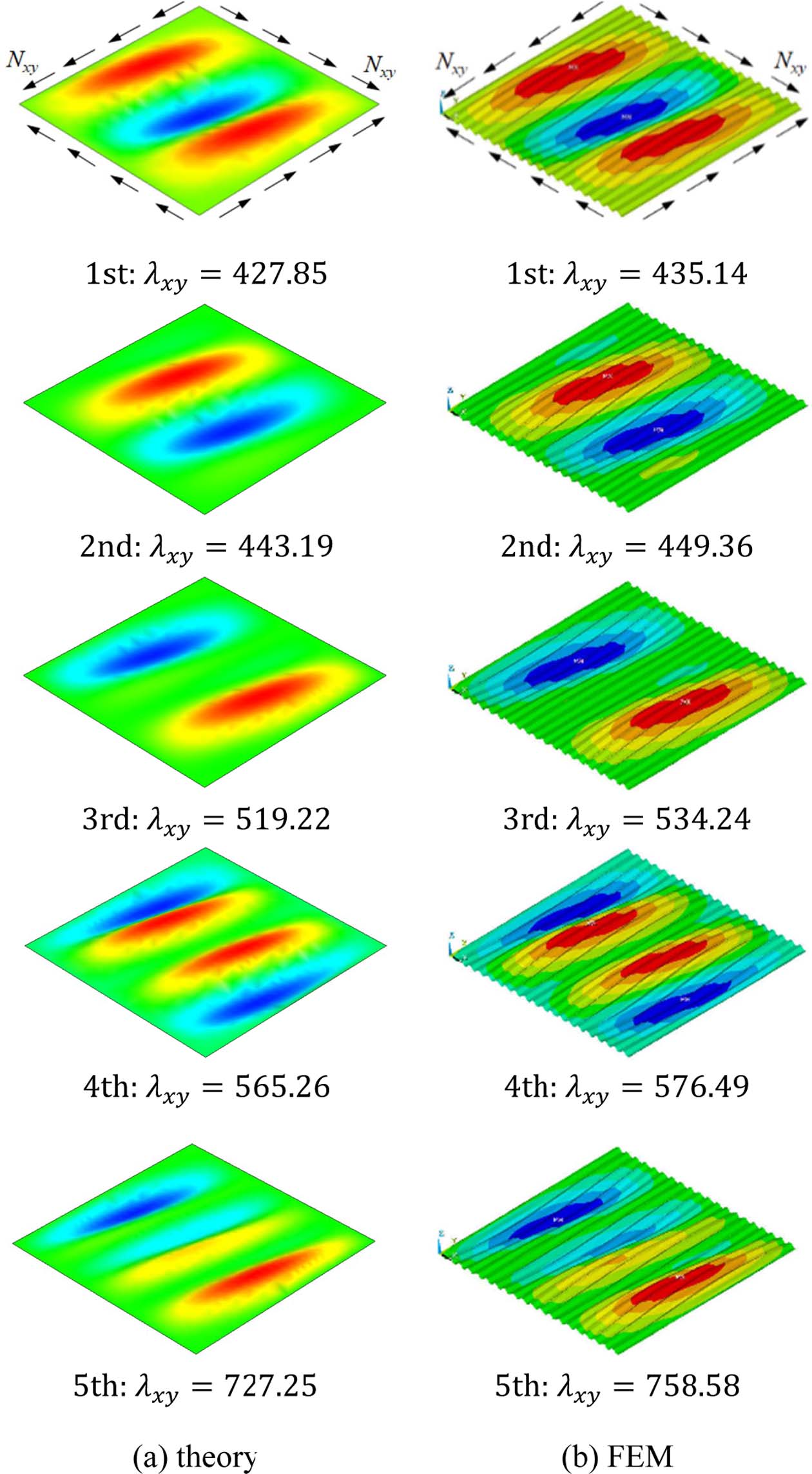Fig. 3 Comparison of buckling loads and mode shapes of corrugated plate subjected to in-plane shear load, Nxy |