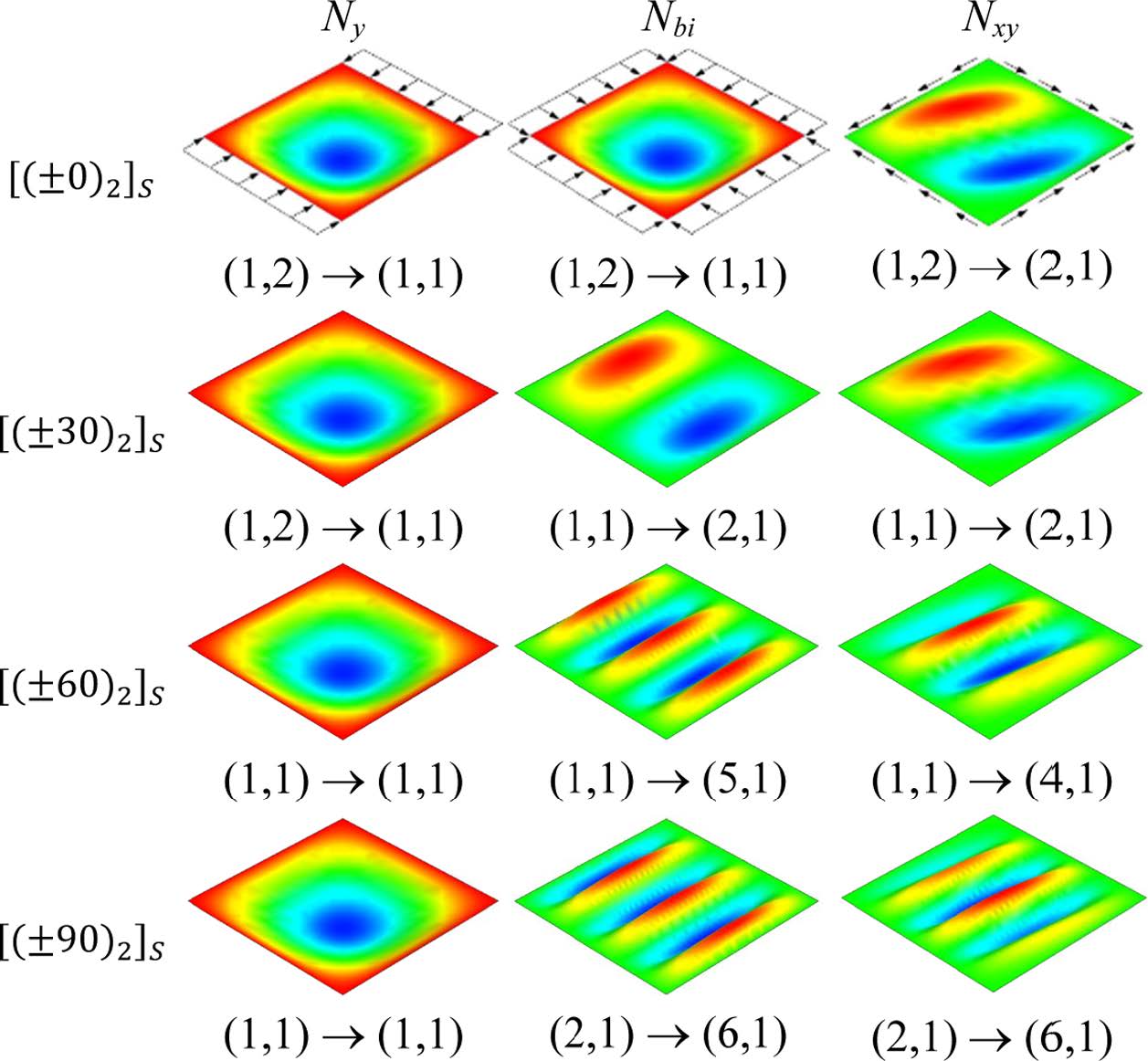 [(±θ)2]S로 적층된 복합재료 주름판에 대해 적층각 θ가 좌굴하중에 미치는 영향을 알아 보기 위해 Fig. 4를 제시하였다. 이때 고려된 주름판은 앞의 예제 Fig. 2 및 Fig. 3에서 사용한 것으로 주름각 만을 a = 60°로 변경하였다. 양방향 압축인 경우 좌굴이 상대적으로 약한 주름 방향으로 일어나기 때문에 좌굴하중이 다른 하중과 달리 매우 작은 값을 갖으며, 좌굴하중이 적층각에 따라 증가하다 감소하는 거동을 한다. 내평면 전단하중을 받는 경우에는 적층각에 따라 좌굴하중이 초기에는 거의 변화가 없다가 서서히 증가를 하다가 거의 일정한 값으로 접근을 한다. y 방향 압축하중 Ny를 받는 경우에도 내평면 하중에 대한 거동과 유사하나 적층각에 따라 좌굴하중이 증가하는 정도가 가파르다. 이와 같이 적층각이 좌굴하중에 미치는 영향이 다른 하중에 비해 크게 나타나는 것은 Fig. 5에 제시된 것처럼 다른 하중에 의한 좌굴형상이 적층각에 따라 x 방향 모드가 변경되지만 한 방향 압축을 받는 경우에는 적층각에 관계없이 항상 좌굴형상이 (1, 1)로 변하지 않기 때문이다.
