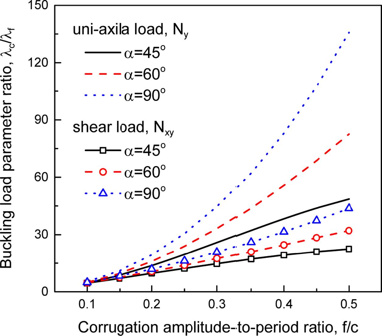 Fig. 6 Effect of corrugation amplitude-to-period ratio on buckling load |