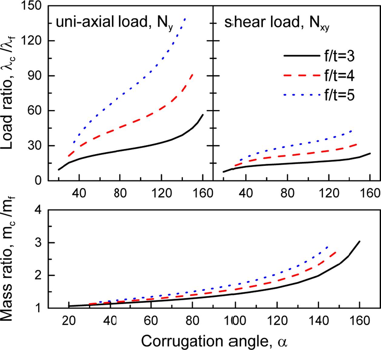 주름각이 내평면 좌굴하중에 미치는 영향을 보다 자세히 알아보기 위해 Fig. 7을 제시하였다. 이때 주름수는 15개이다. 그림에서 좌굴하중비(λc/λf) 및 질량비(mc/mf)를 주름각에 따라 제시하였다. 그림에 나타난 것처럼 주름각의 증가와 함께 질량 및 좌굴하중은 증가를 한다. 특히 f/t가 클수록(즉, 주름높이가 클수록) 보다 민감하게 좌굴하중이 증가를 한다. 또한 f/t가 클수록 전단 좌굴하중보다 압축 좌굴하중에 주름각의 영향은 크다는 것을 볼 수 있다. 예로써 f/t = 5인 경우 질량은 3배정도 증가하지만 전단좌굴하중은 약 45배, y-방향 압축좌굴하중은 150배 증가를 한다. 이처럼 주름판을 제작함으로써 큰 질량 증가없이 좌굴하중을 매우 크게 증가시킬 수 있음을 볼 수 있다.