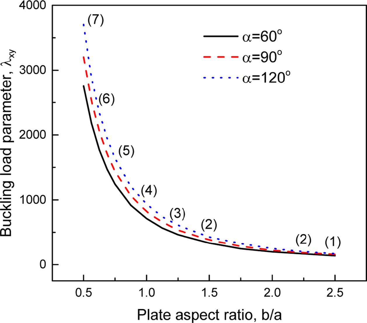 주름판의 형상비인 길이 대 폭의 비(b/a)가 내평면 전단좌굴하중에 미치는 영향을 Fig. 8에 제시하였다. 그림에 나타난 것처럼 모든 주름각에 대해 형상비의 증가에 따라 좌굴하중 매개변수가 감소하는 것을 볼 수 있다. 그림에서 괄호 안의 숫자는 x방향의 좌굴형상에서의 반파수를 나타낸 것으로 형상비 b/a가 커짐에 따라 감소하는 것을 볼 수 있다. 이 때 y 방향의 반파수는 모두 1이다.