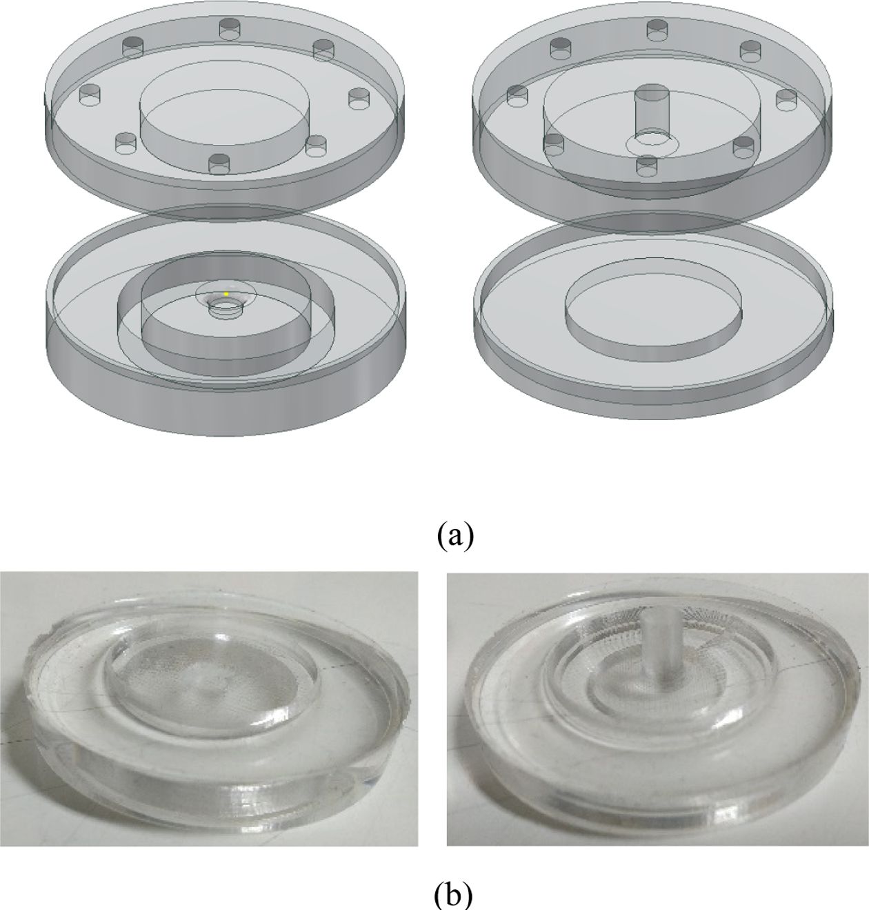 Fig. 1 Module structure made of PDMS; (a) Molds for module forming, (b) Fabricated upper and lower modules |