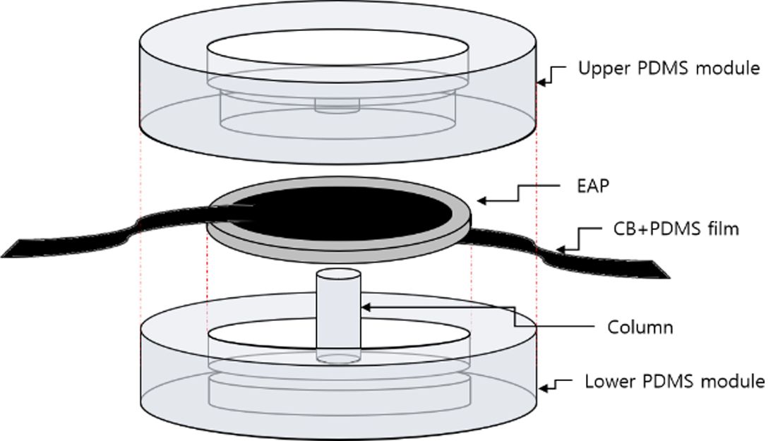 EAP의 전극과 세포 간의 접촉을 방지하며, 상/하부의 PDMS 모듈 (Module) 사이에 삽입되는 EAP 구동기는 중앙의 PDMS 기둥(Column)을