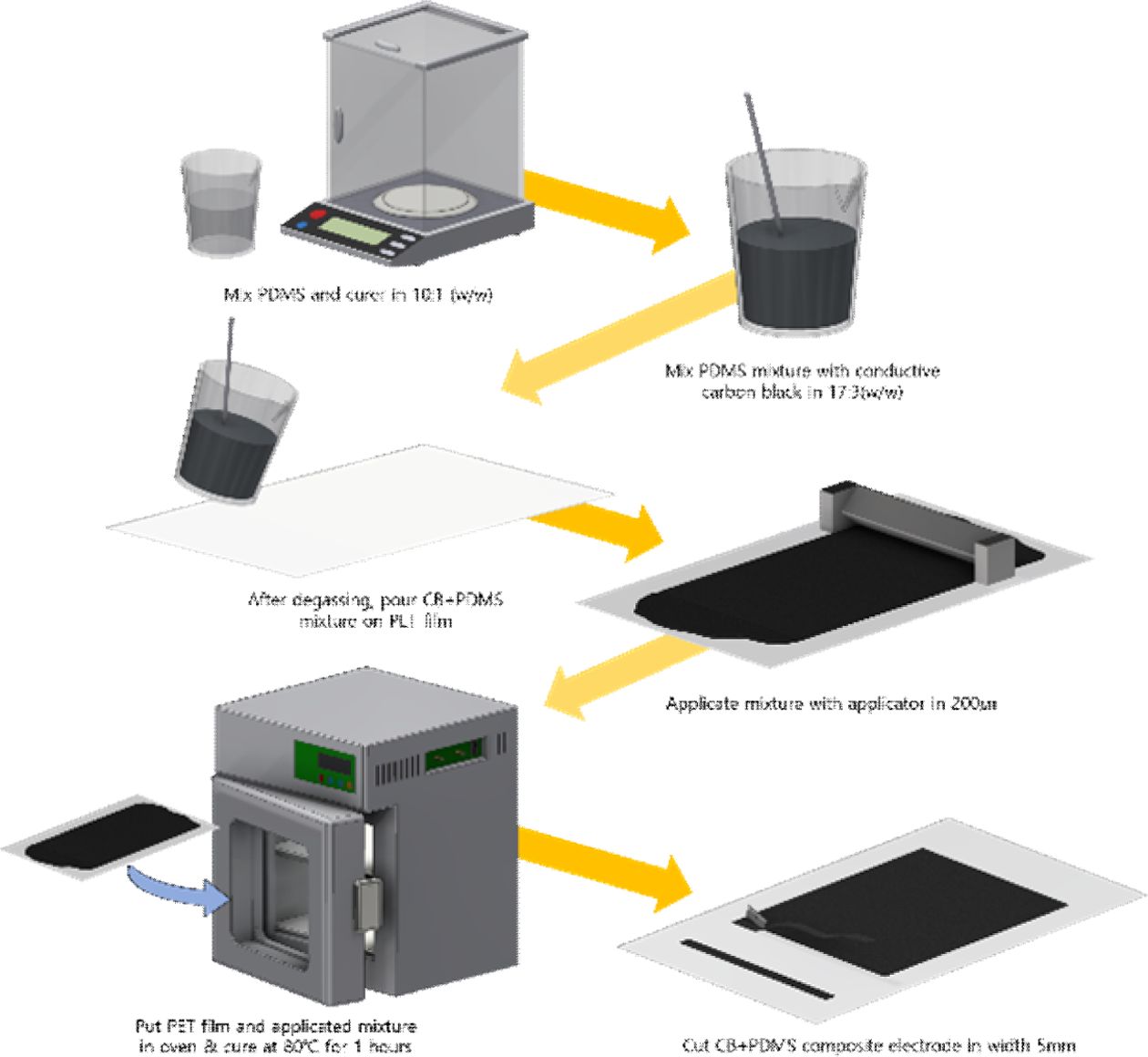 전도성 PDMS 필름을 제조하기 위해 PDMS 경화제를 10:1 질량비로 섞은 뒤, 전도성 카본 블랙 분말을 PDMS 용액과