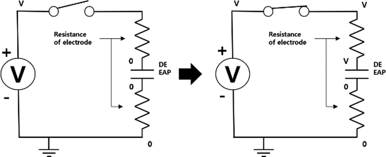 유전체로 갖는 커패시터와 같으므로, 전압이 인가될 경우 양단의 전극에 전하가 충전되며 그림과 같은 전압상태를 갖게 된다. 즉, 전류가 전기활성고분자