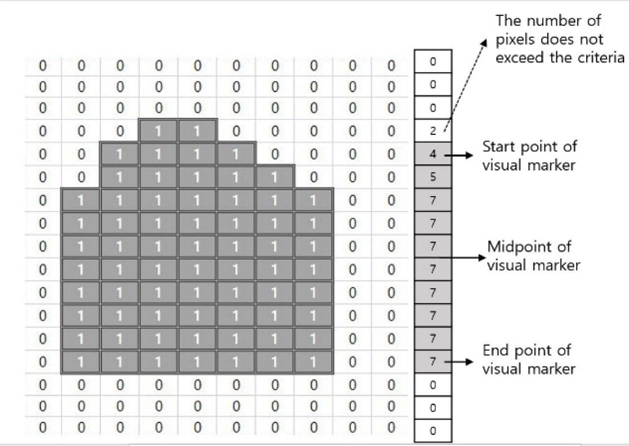 촬영한 영상은 MATLAB의 영상처리 기능을 사용하여 데이터화 하였다. 연산의 고속화를 위하여, 촬영된 트루컬러 이미지를 각 픽셀당 0~255 사이의 값을 갖는 회색조 명암 이미지로 변환하였다. 또한, 배경으로 생기는 노이즈를 제거하기 위하여, 시각적 마커가 움직이는 범위만을 기록할 수 있도록 다각형 관심 영역 지정(ROI) 함수를 이용하여 이진 영상 마스크를 적용하였다. 이진 마스크가 적용된 명암 이미지의 각 픽셀 중 30 미만의 값을 갖는 픽셀들은 1로, 30 이상의 값을 갖는 픽셀들은 0으로 변환시켜 이미지를 전체적으로 이진화 시킨 후, Y축으로 히스토그램화 하였다. Y축 히스토그램 값에서 4이상의 값을 갖는 처음과 끝의 Y축 위치를 구한 뒤 나누어, 시각적 마커의 중앙점 위치를 도출하였다. 도출된 마커의 위치 데이터는, 불러온 영상의 FPS(Frame per second)로부터 계산된 이미지 간의 시간차 데이터와 결합하여 Fig. 8과 같은 시간-위치 데이터로 기록하였다.