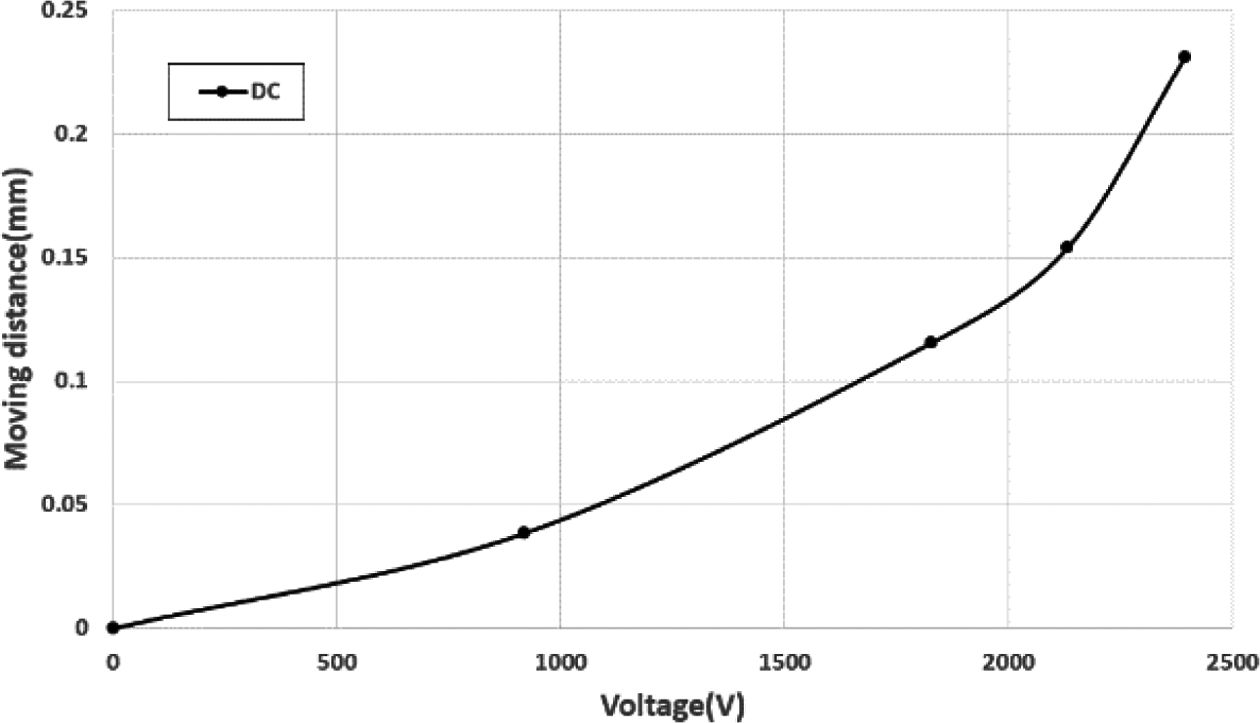 입력 전압의 2000배 승압이 가능한 증폭기(Amplifier)를 함수발생기(Function generator)에 연결하여, 사인파의 진폭이 0~4.8 kV(피크 0~±2.4 kV)인 AC전압을 0.5, 1.0, 1.5, 2.0 Hz의 조건으로 전기활성고분자 구동부에 인가하였다. 또한 0~2.4 kV의 DC 전압을 인가하는 실험을 진행하여 AC전압과의 차이를 비교하였다.