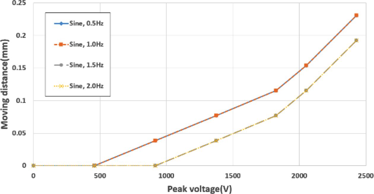 DC 전압 인가 시의 결과인 Fig. 9와 AC 전압 인가 시의 결과인 Fig. 10을 비교해 보면, 1.0 Hz의 거동까지는 DC 전압 인가 시의 변형량과 거의 동일하지만, 1.5 Hz부터는 1 pixels (=0.0385 mm)씩 전체적인 변형량이 감소하는 것을 확인 할 수 있다. 반면 모든 결과에서 주파수가 높아져도 변형량에만 차이가 있을 뿐, 변형 형태는 거의 비슷한 것으로 나타났다.