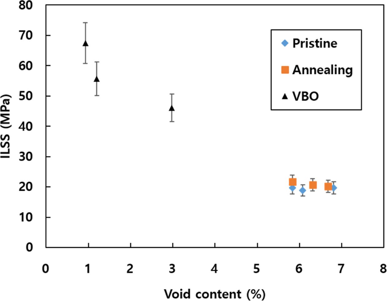 복합재에 대하여 어닐링 및 진공백 공정을 추가로 수행한 후 추가 공정이 층간 전단 강도에 미치는 영향을 분석하였으며 비교를 위하여 추가 공정을