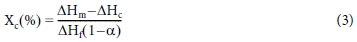 결정화도는 식 (3)을 통해 계산되었다. 식 (3)에서 Hm은 용융점에서의 융합 엔탈피이고,