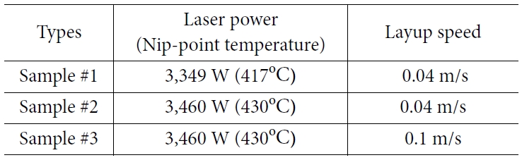 적층 온도 및 적층 속도에 따라 3개의 열가소성 복합재를 제작하였다. 본 연구에서는 417oC의 적층 온도에서 0.04 m/s의 적층 속도로