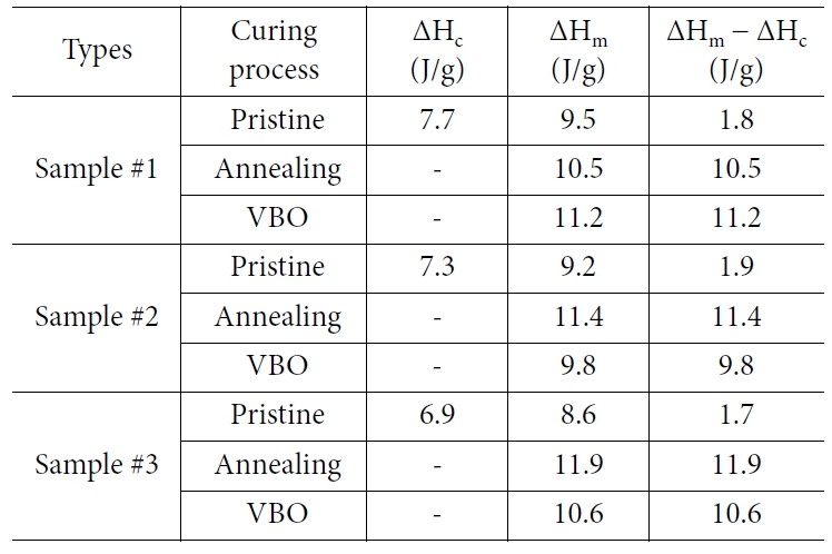 어닐링 및 진공백 공정이 수행된 경우의 결정화도는 각각 3.1, 20.8, 20.1%이다. 적층 온도 및 속도와 상관없이 프리스틴의 경우 4.0~4.3% 범위의 결정화도 값을 획득하였다. 하지만 어닐링 및 진공백 공정이 추가된