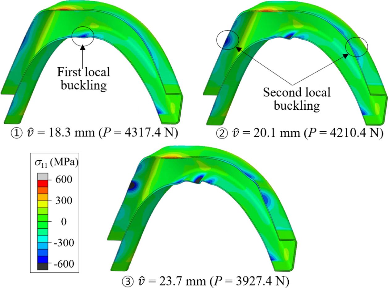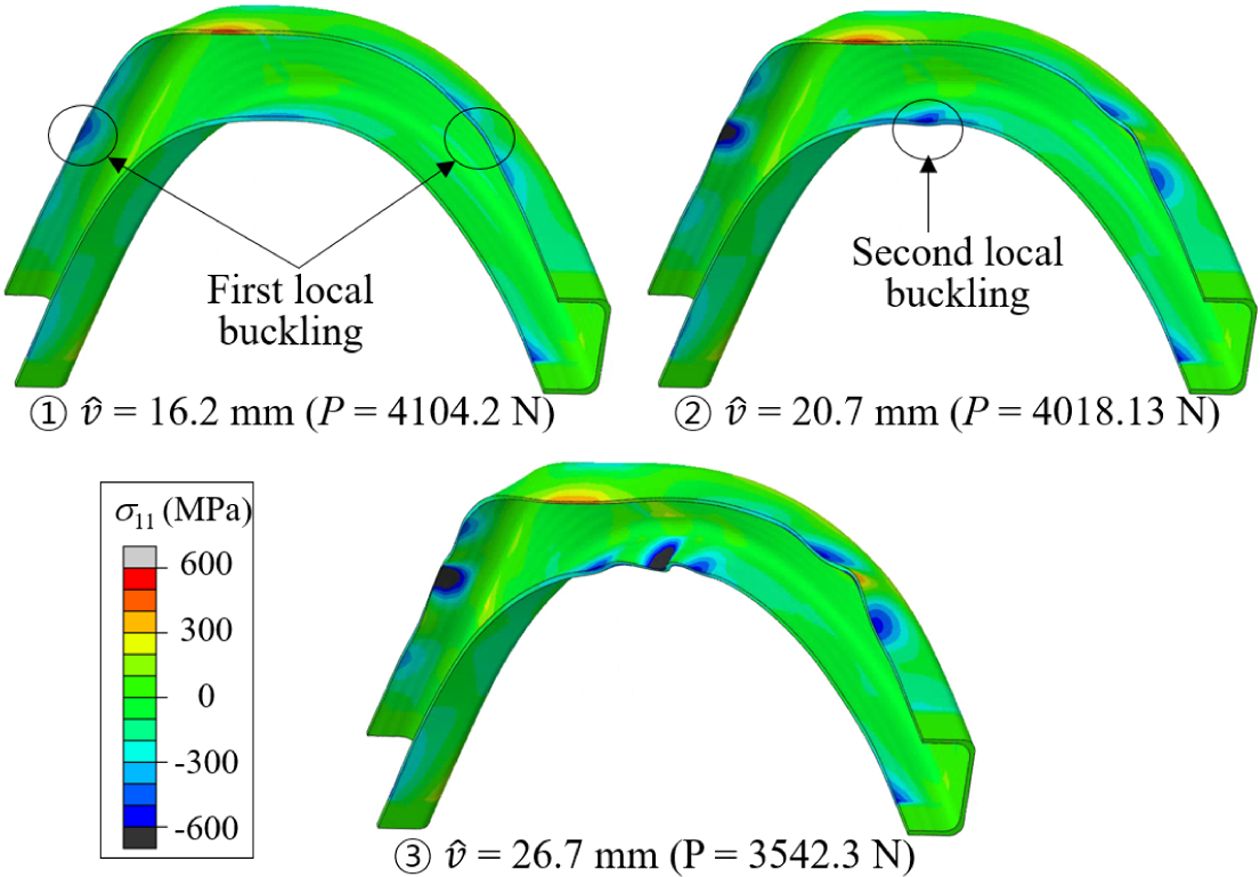 buckling appeared at the bottom flange of the crown part. Further increasing