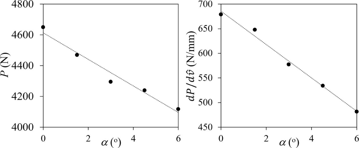 Fig. 15 Effect of tilting on ultimate buckling load (left) and initial stiffness (right) |