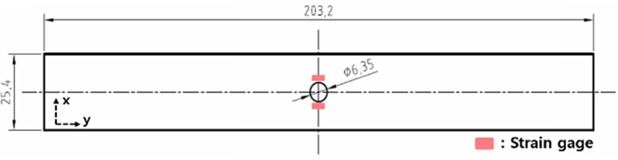 원공 양쪽에 일축 스트레인 게이지를 부착하였다. 스트레인 게이지는 시편의 인장방향 변형률을 측정할 수 있도록 Fig. 2의 y축을 따라 부착되었다. 추가적으로, 디지털이미지상관법(DIC)을 이용하여 시편 표면에서 변형률