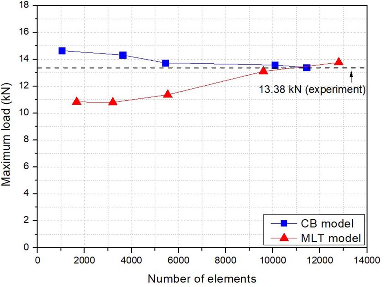 수를 변화시키며 수행한 PFA를 통해 계산된 최대 하중 결과를 보여준다. CB 모델의 메쉬 의존성을 확인하기 위해 요소 수를 변경하며 해석을 수행한