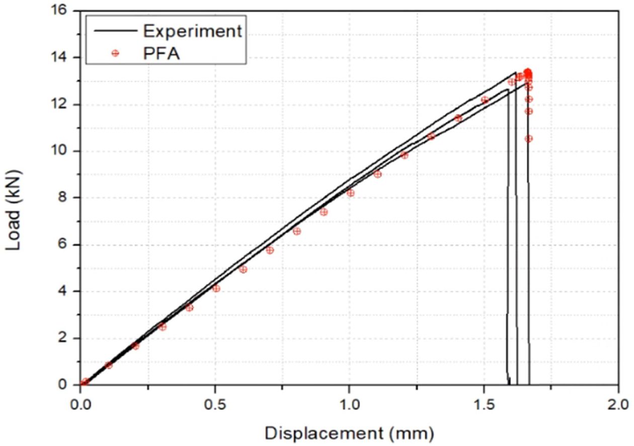 Fig. 5 Load-displacement curves for open-hole tensile test and PFA results |