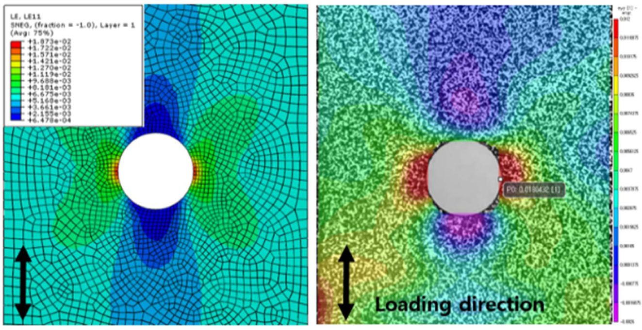 수 있다. 원공 양단에서 발생하는 최대 변형률 값은 해석결과와 시험결과에서 최대 3.66% 이내에서 일치하였다. 또한, 원공 복합재료 인장시편의