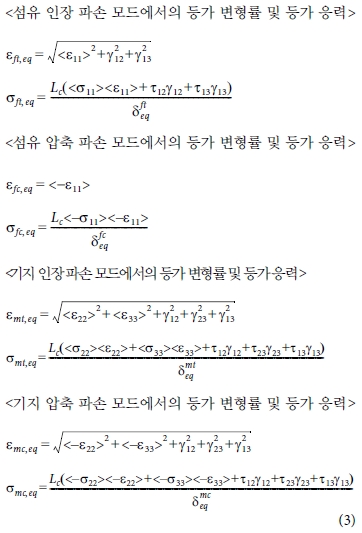 모드에서의 등가 변형률과 등가 응력성분들은 다음과 같이 각 파손모드에서 각 방향의 변형률 및 응력 성분들을 고려하여 계산된다. 수직 및 전단변형률은