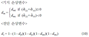 (damage variable)을 이용하여 구현한다. 손상변수는 손상의 정도가 커짐에 따라 최대 1의 값까지 커지게 되며, 이 변수는 재료의 강성행렬을