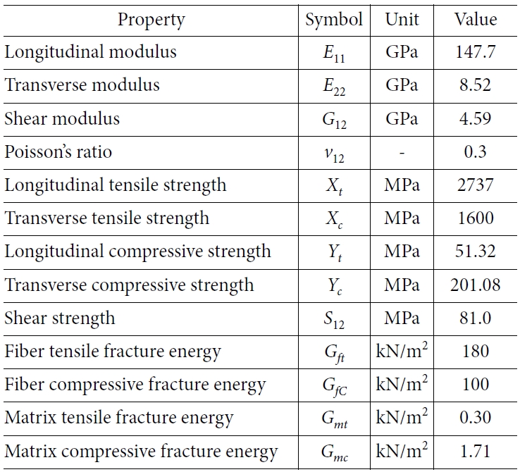 인장 및 압축 강도를 의미하며, 는 섬유 직각 방향에서의 인장 및 압축 강도를 의미한다. S는 각 방향에서의 전단강도를 의미한다. 본 논문에서는 Lapczyk 등[8]이 제안한 CB 모델이 접목된 손상변수를 이용하여 PFA를 수행하였다. 손상변수를 계산하기 위해, FEM을 통해 계산된 각 모드(섬유 인장/압축, 기지 인장/압축)에서의 변형률 및 응력 값들을 이용하여 등가 변위, 등가 응력의 계산이 수행된다. 각