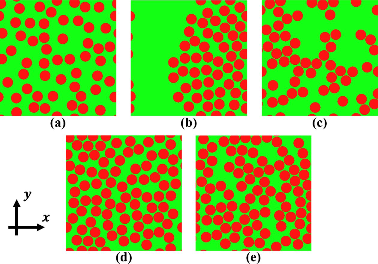 Fig. 1 RVE configuration of Vf= 35%: (a) RSA, (b) RSE, (c) RFR,Vf= 55%: (d) RSE, (e) RFR |